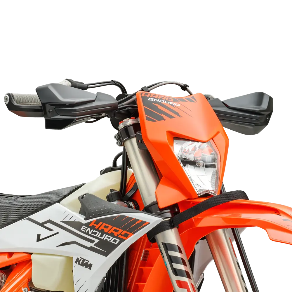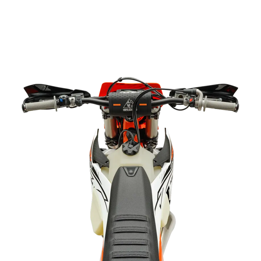 Held in place by a set of CNC-machine triple clamps, the handlebar on the KTM 300 EXC HARDENDURO features a unique bar pad and soft, grey, ODI lock-on grips for ultimate control. A set of wrap-around handguards provides further protection from unwanted obstacles in your path.