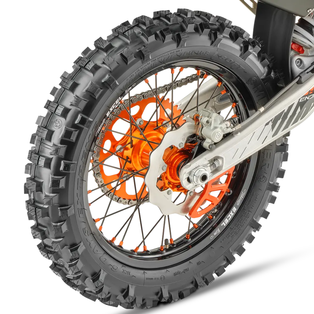 The KTM 300 EXC HARDENDURO rolls on a full-factory wheelset made up of high-strength black alloy wheels coupled to orange-anodized CNC-machined hubs, black spokes, and orange aluminum nipples. These are wrapped in a set of ultra-grippy Metzeler 6 DAYS Extreme tires providing exceptional traction in all conditions.