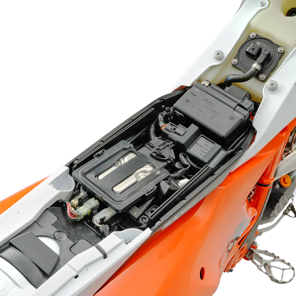 As with the rest of the 2-stroke EXC range, the KTM 300 EXC HARDENDURO is fitted with a proven, reliable electric start system. Powered by an ultra lightweight 2 Ah lithium-ion starter battery, it provides a safe, reliable starting time and time again, while the wiring harness has most of the electrical components carefully positioned under the seat for easy accessibility.