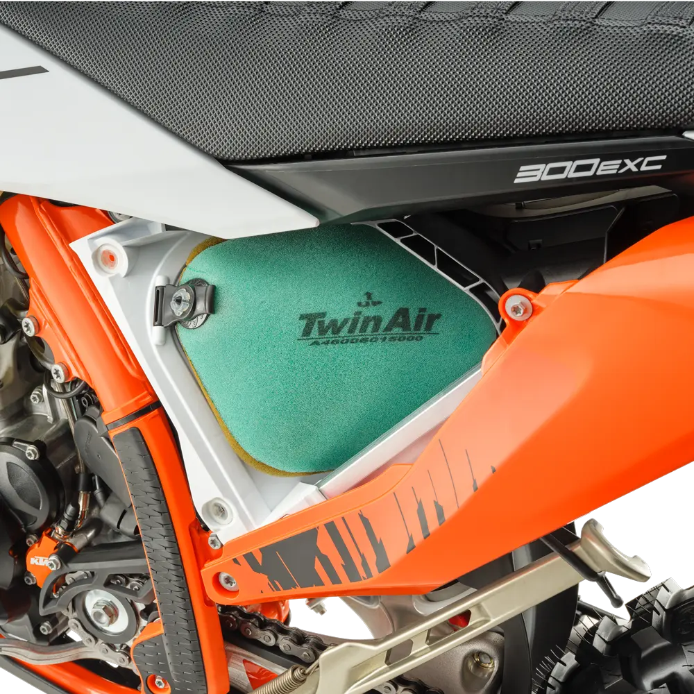 The air filter box is designed to ensure maximum airflow with minimal water intrusion. Precision in how the inlet ducts are positioned is aimed at preventing air deformation and maintaining filter protection. An enduro-specific splash protector under the airbox prevents water or dirt from splashing up from the rear wheel, while the Twin Air filter and air filter support design features a simple fail-proof mounting system for safe and accurate filter installation. All this ensures the air filter is easily accessed, without tools, for fast track-side maintenance.
