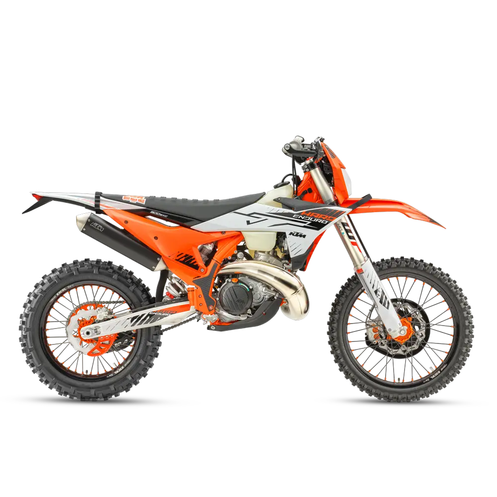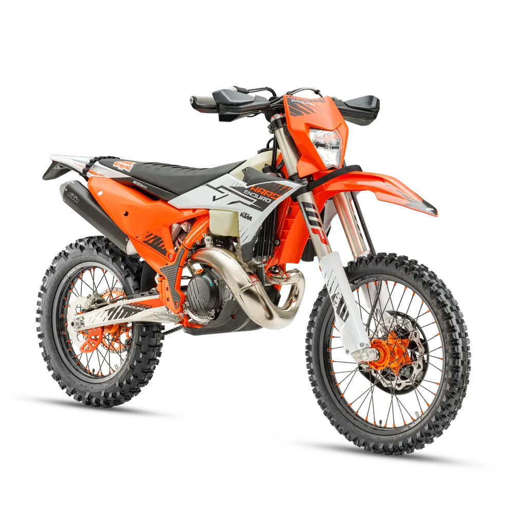 Specifically engineered for longitudinal rigidity, the KTM 300 EXC HARDENDURO is engineered around a gloss-orange powder-coated frame providing exceptional rider feedback, energy absorption, and high-speed stability. This is achieved by repositioning the rotating masses in the frame along with a forged steering head connection. The footrest mounts also feature a slim design for less risk of hooking up. And when the ride comes to an end, a forged one-piece side stand ensures your enduro weapon stands proud.
