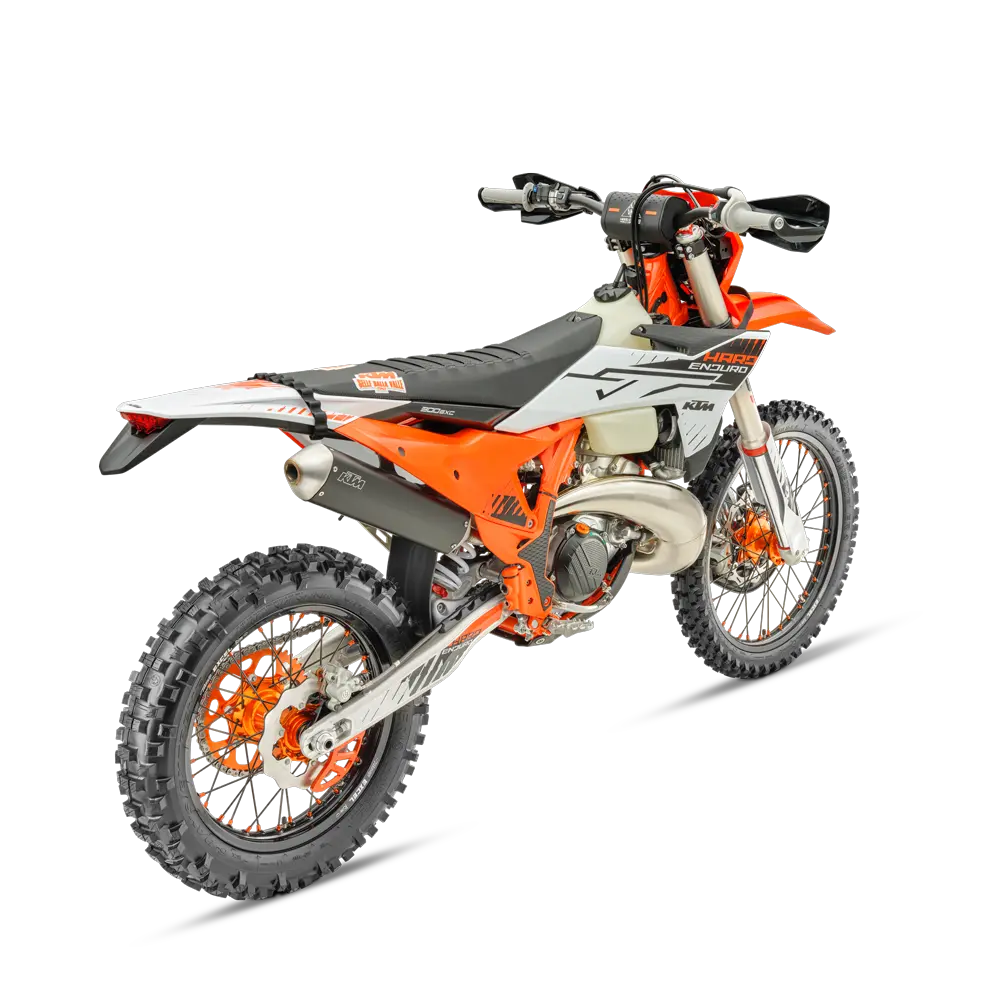 This is one graphics package you won't want to swap out! The KTM 300 EXC HARDENDURO boasts striking striped black-on-white spoiler graphics setting off the signature orange frame and rear fender.