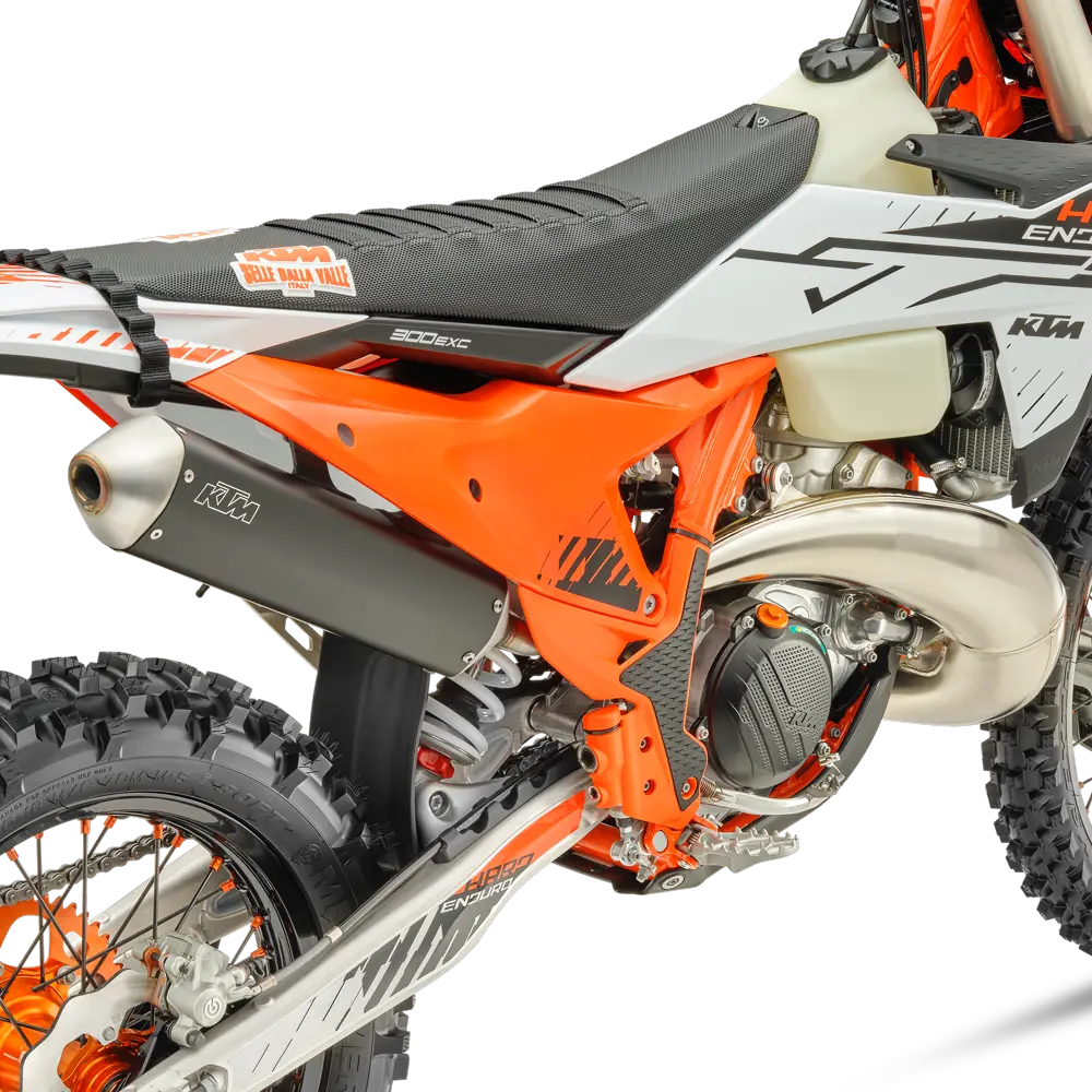 Bringing the Braaap! Thanks to the KTM 300 EXC HARDENDURO's compact engine design, the header pipe is designed with the target of achieving more ground clearance and reducing the risk of damage when riding over deep roots, ruts, or climbing steep rocks. The silencer is crafted from lightweight aluminum, saving weight and provides the signature low-down 2-stroke burble for this rock-hopping hero.