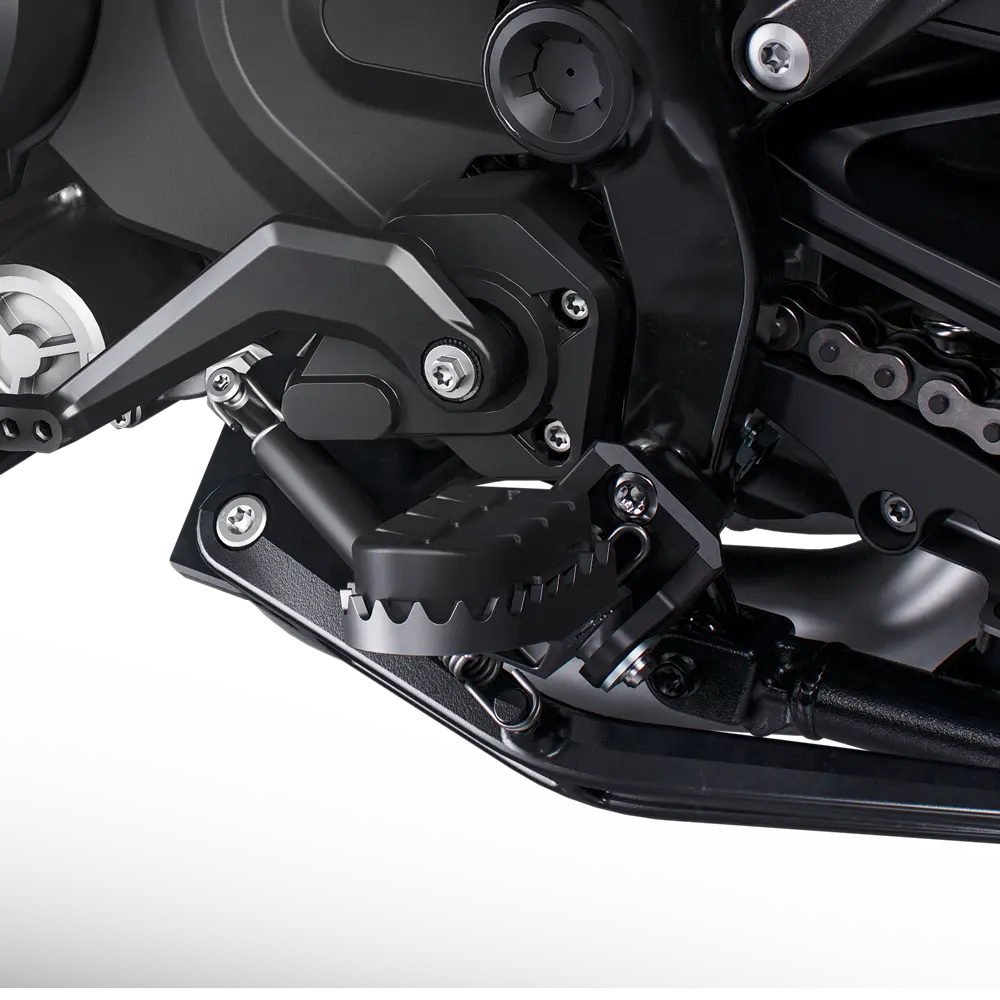 The footrest mounting position is lowered by 8 mm to improve the rider's comfort thanks to a wider knee angle, while being moved 10 mm outwards for better contact and feel when standing on the pegs.