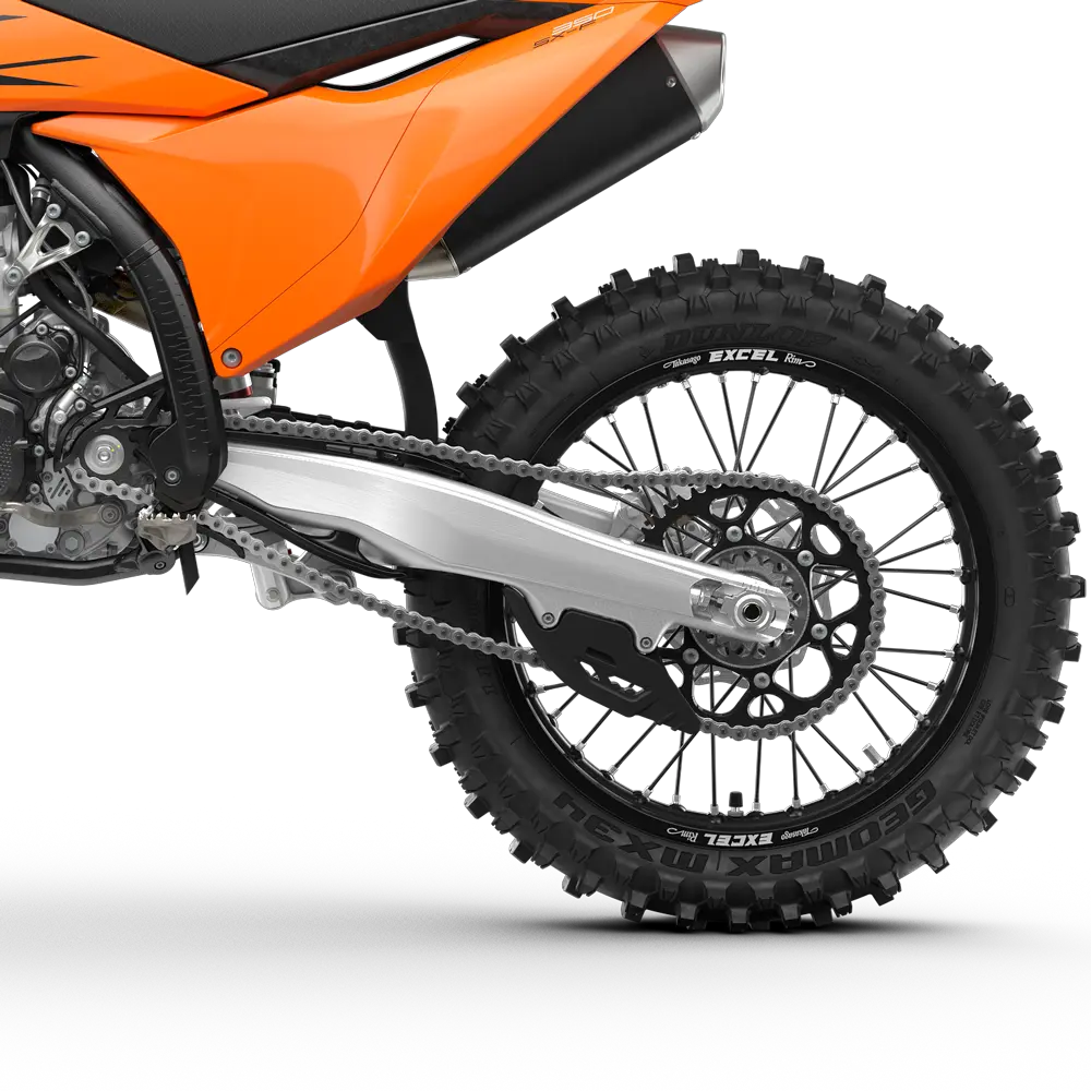 Keeping things in check at the rear, the WP XACT rear shock for uses settings directly from the KTM Factory Racing Teams. The frame and shock geometry mean more ground clearance at the linkage, making it less susceptible to bottoming out. Small diameter linkage bolts save weight, while new linkage seals refine rear shock response and advanced damping characteristics.