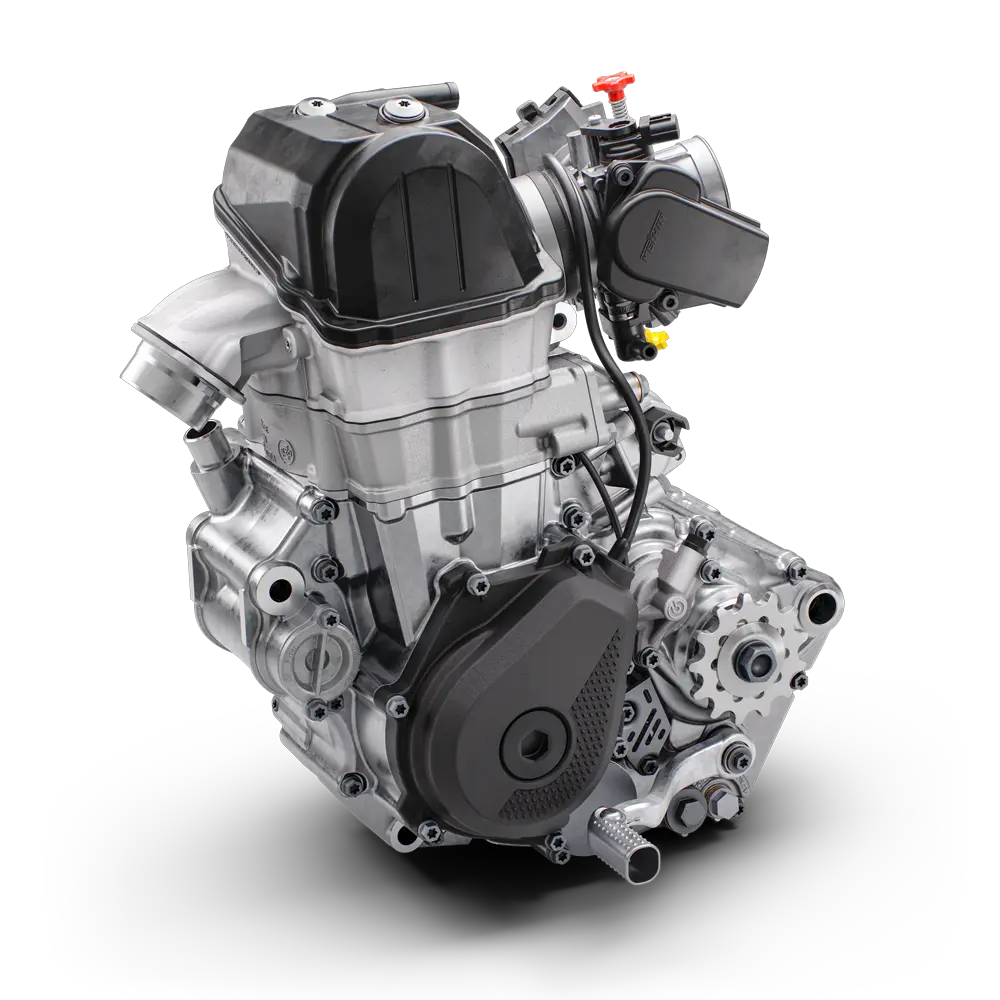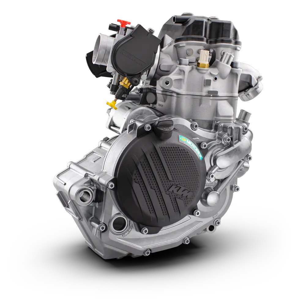 The KTM SX-F engine is tilted 2° backward, this means greatly improved mass centralization and reduced overall weight, benefiting handling and anti-squat behavior. A silencer offers an improved response in combination with the mapping switch and provides a slightly quieter exhaust note.