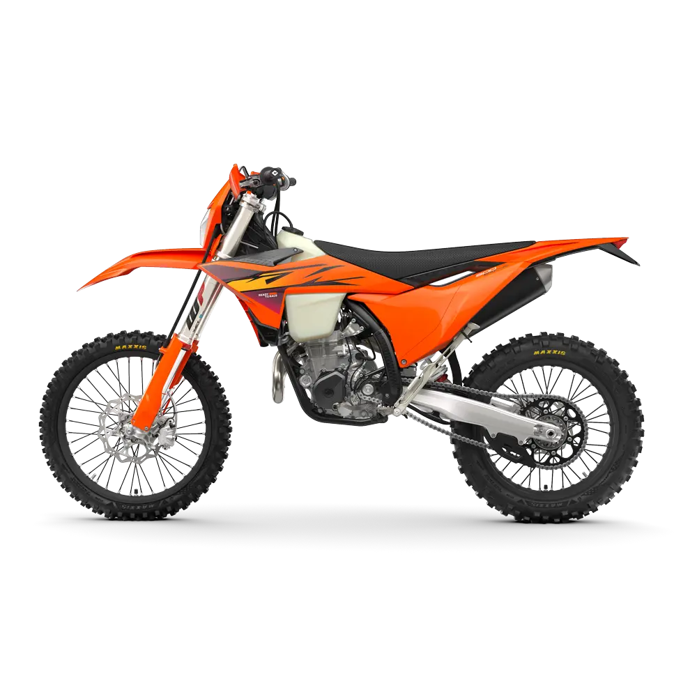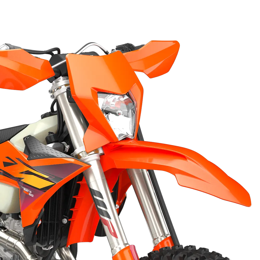 The KTM Enduro range features a rider-focussed body-position triangle, providing improved knee contact - especially when standing on the pegs - with improved gripping surfaces all around. With the plastics working to expel mud buildup in wet, muddy conditions, a flat seat profile with a high grip seat cover providing exceptional rider movement and control, and a polyamide-reinforced aluminum subframe providing unmatched rider feel and feedback, your only concern is navigating the terrain ahead of you.