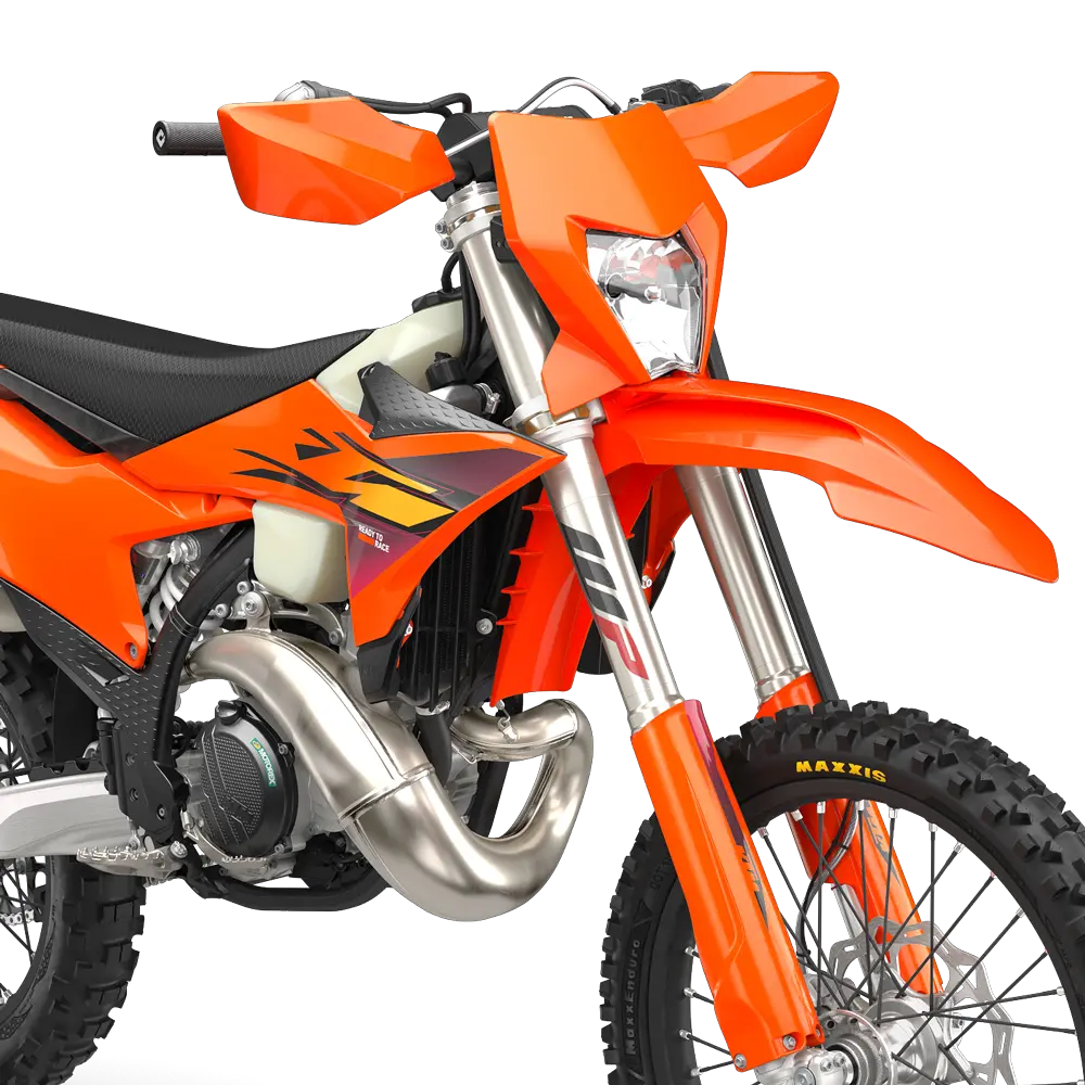 Specifically engineered for longitudinal rigidity, the KTM Enduro range is engineered around a gloss-orange powder-coated frame providing exceptional rider feedback, energy absorption, and high-speed stability. This is achieved by repositioning the rotating masses in the frame along with a forged steering head connection. The footrest mounts also feature a slim design for less risk of hooking up. And when the ride comes to an end, a forged one-piece side stand ensures your enduro weapon stands proud.