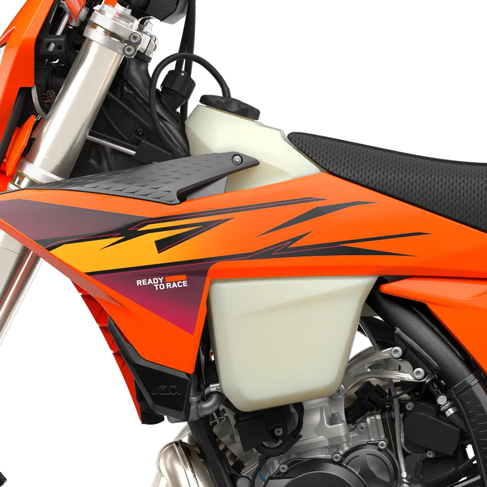 The transparent, polythene (XPE) fuel tank is a signature element of the KTM Enduro lineup. Having undergone thorough race testing in everything from the GNCC to the hardest of FIM hard enduros, these tanks are built, well, like tanks! A one-piece fuel pump and filter manage fuel supply, while servicing is made extra simple with easy fuel filter access. What's more, an updated fuel tank roll now holds the tank more firmly in place and protects the frame against scrubbing.