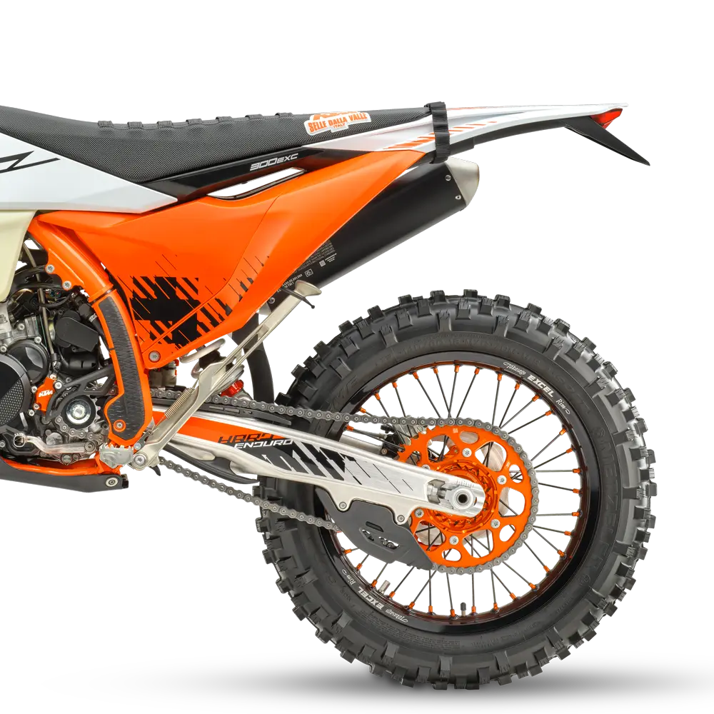 This is one graphics package you won't want to swap out! The KTM 300 EXC HARDENDURO boasts striking striped black-on-white spoiler graphics setting off the signature orange frame and rear fender.