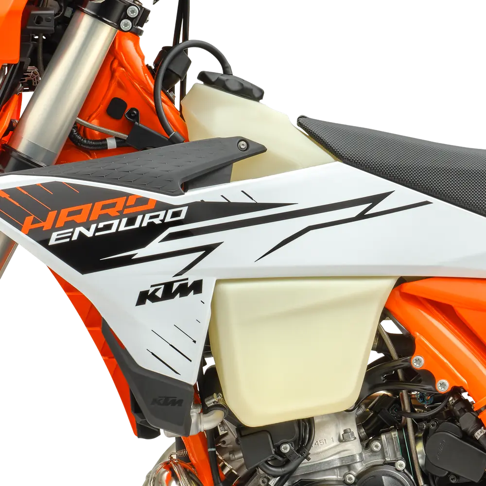 The transparent, polythene (XPE) fuel tank is a signature element of the KTM Enduro lineup. Having undergone thorough race testing in everything from the GNCC to the hardest of FIM hard enduros, these tanks are built, well, like tanks! A one-piece fuel pump and filter manage fuel supply, while servicing is made extra simple with easy fuel filter access. What's more, an updated fuel tank roll now holds the tank more firmly in place and protects the frame against scrubbing.
