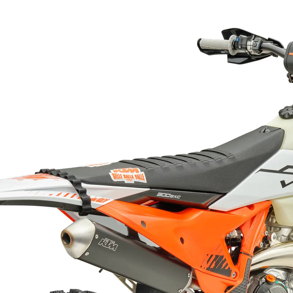 Swing your leg over the KTM 300 EXC HARDENDURO and you're met with a diamante Facotry seat, wrapped in a back seat cover with transversely stitched ribs, and protected by a water-resistant coating, you can be assured of maximum grip alt all times, with unrestricted freedom of movement when you need it.