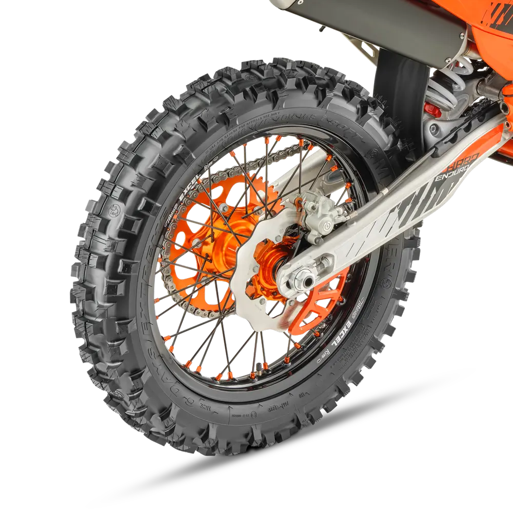 The KTM 300 EXC HARDENDURO rolls on a full-factory wheelset made up of high-strength black alloy wheels coupled to orange-anodized CNC-machined hubs, black spokes, and orange aluminum nipples. These are wrapped in a set of ultra-grippy Metzeler 6 DAYS Extreme tires providing exceptional traction in all conditions.